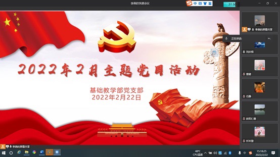 为激励全体党员在抗疫中显担当,扬作为,基础教学部党支部于2022年2月22日组织开展了2月份线上主题党日活动。会议由支部书记刘庆根主持,支部全体党员参加了会议。