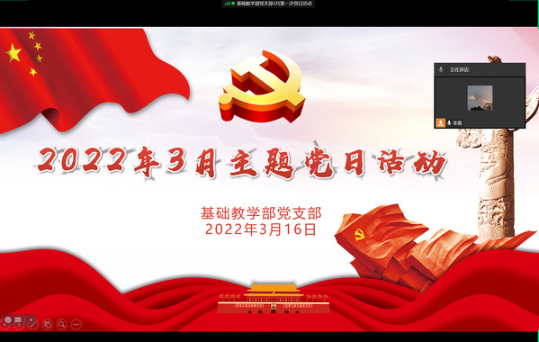 2022年3月16日,基础教学部党支部组织开展了3月份线上主题党日活动,会议由支部宣传委员刘亚军同志主持,支部全体党员参加了会议。