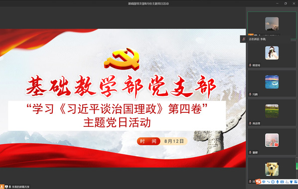 2022年8月12日,基础教学部党支部组织开展了以“学习《习近平谈治国理政》第四卷”为主题的学习活动,会议由支部宣传委员刘亚军同志主持,支部23名党员参加了会议。