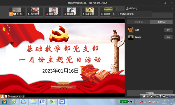 2023年1月16日,基础教学部党支部组织开展一月份线上主题党日活动,会议由支部书记刘庆根同志主持,支部21名党员参加了会议。