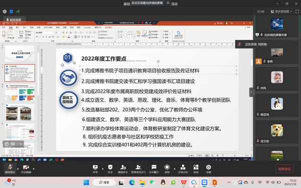 2023年1月16日,基础教学部党支部组织开展了2022年线上党员民主评议工作,会议由支部书记刘庆根同志主持,支部21名党员参加了会议。